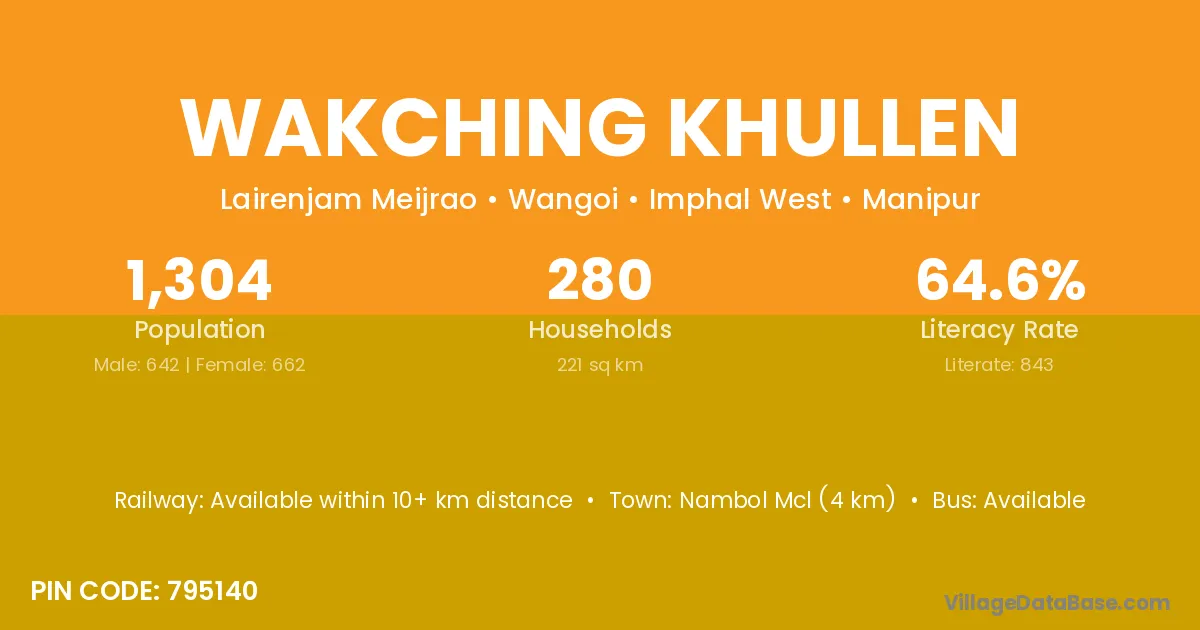Nambol Mcl (4 km) is the nearest town to Wakching Khullen village for major economic activities and is located approximately 4 km away.