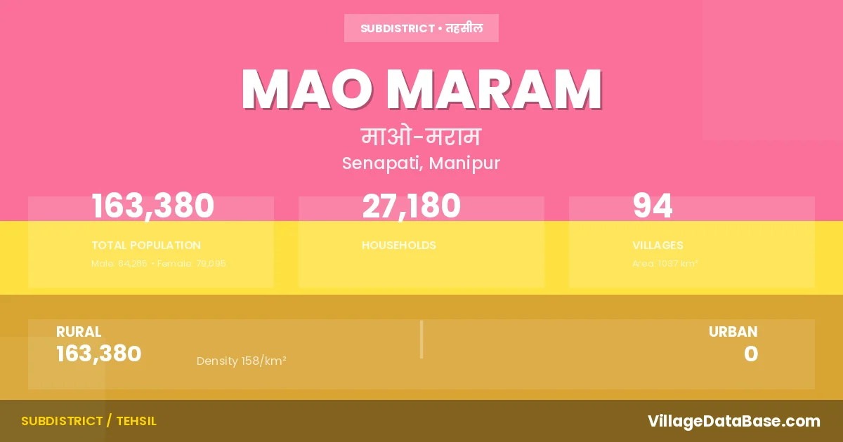 According to the 2011 census The total area of Mao Maram Subdivision is 1037 km², with a population of 163380 people. The population density is 158 inhabitants per square kilometre, and there are approximately 27180 houses in the sub district.