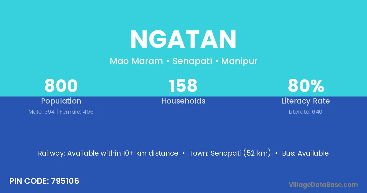 Senapati (52 km) is the nearest town to Ngatan village for major economic activities and is located approximately 52 km away.