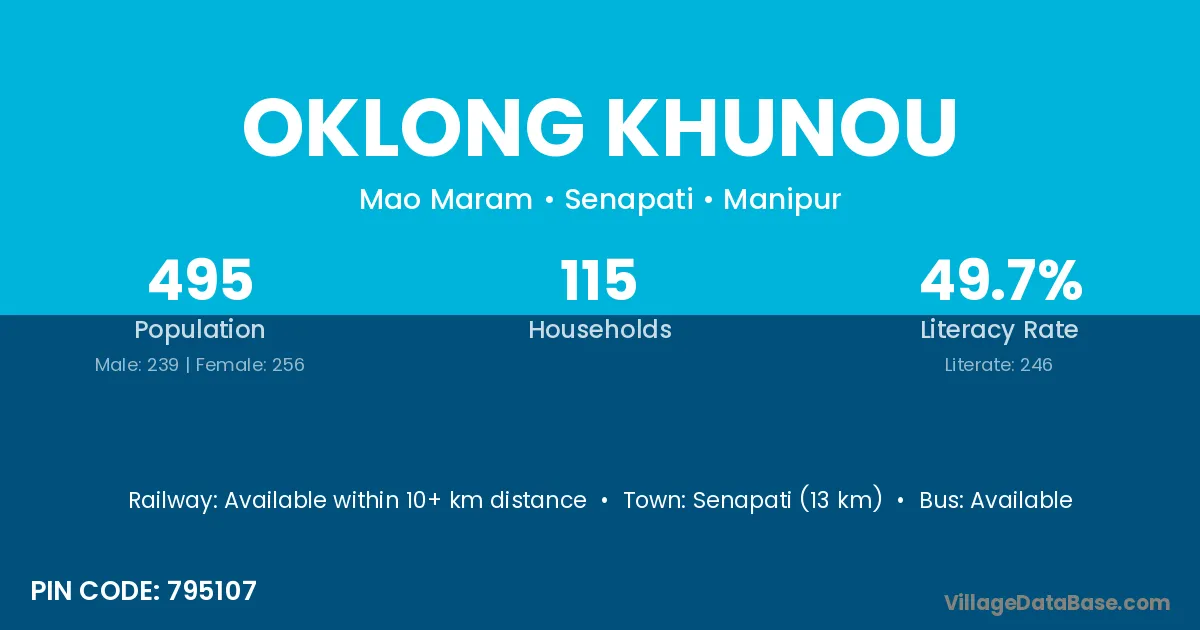 Senapati (13 km) is the nearest town to Oklong Khunou village for major economic activities and is located approximately 13 km away.