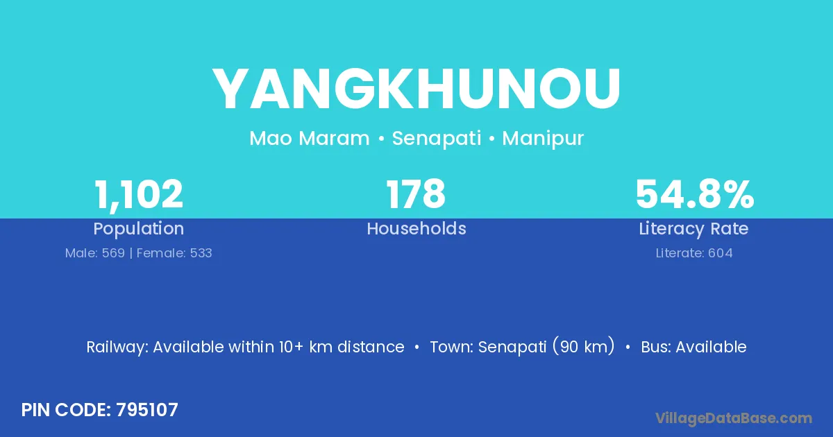 Yangkhunou village has a total population of 1,102 people, of which 569 are males and 533 are females.