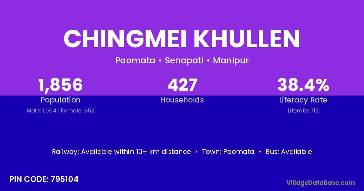 Chingmei Khullen village has a total population of 1,856 people, of which 1,004 are males and 852 are females.