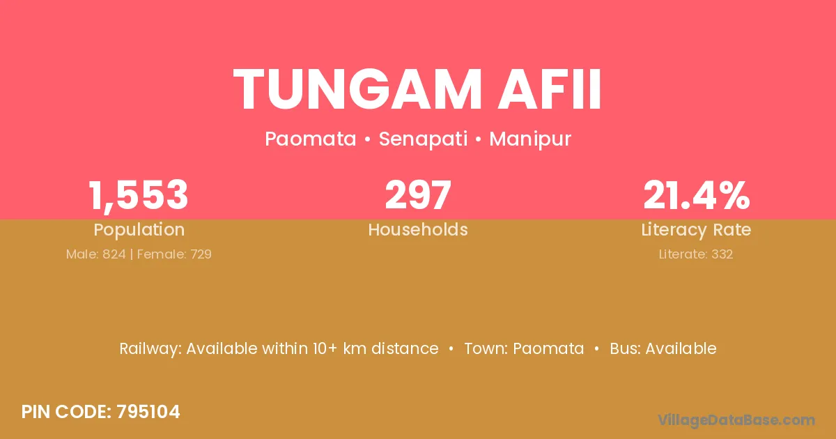 Tungam Afii village has a total population of 1,553 people, of which 824 are males and 729 are females.