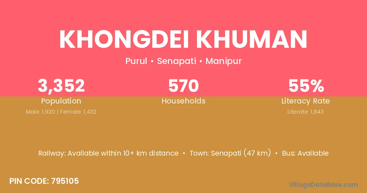 Senapati (47 km) is the nearest town to Khongdei Khuman village for major economic activities and is located approximately 47 km away.