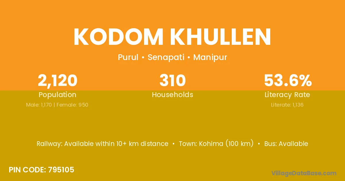 Kohima (100 km) is the nearest town to Kodom Khullen village for major economic activities and is located approximately 100 km away.
