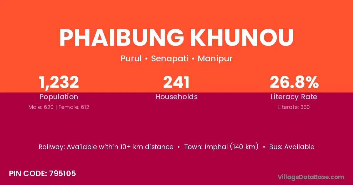 Imphal (140 km) is the nearest town to Phaibung Khunou village for major economic activities and is located approximately 140 km away.