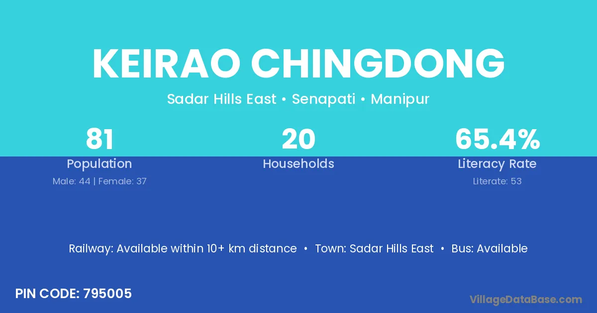 Keirao Chingdong village has a total population of 81 people, of which 44 are males and 37 are females.