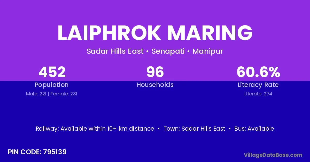 Laiphrok Maring village has a total population of 452 people, of which 221 are males and 231 are females.