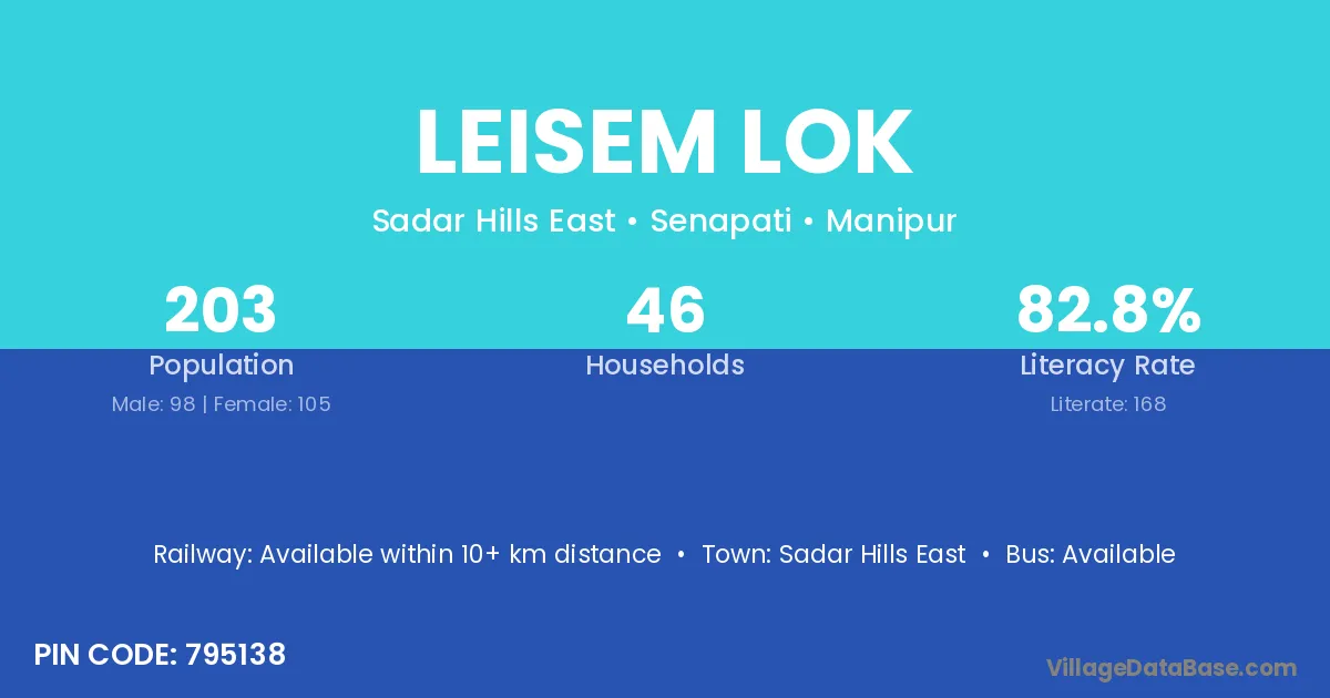 Leisem Lok village has a total population of 203 people, of which 98 are males and 105 are females.