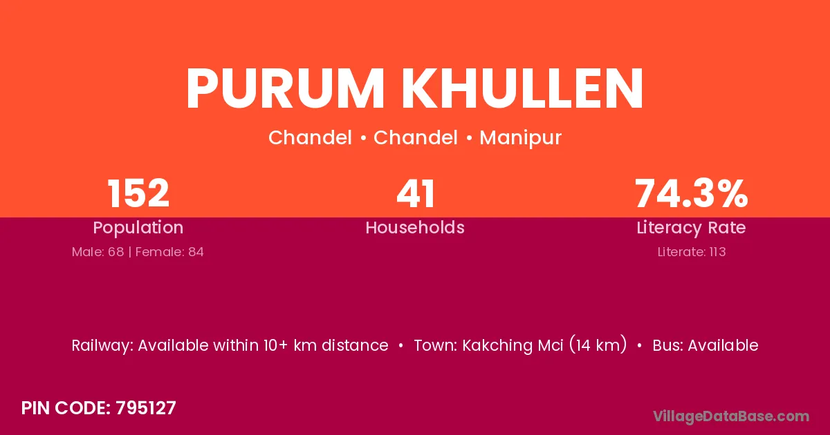 Purum Khullen village has a total population of 123 people, of which 63 are males and 60 are females.