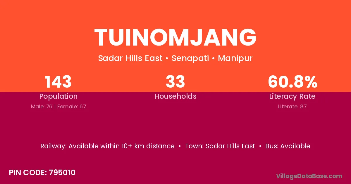Tuinomjang village has a total population of 143 people, of which 76 are males and 67 are females.