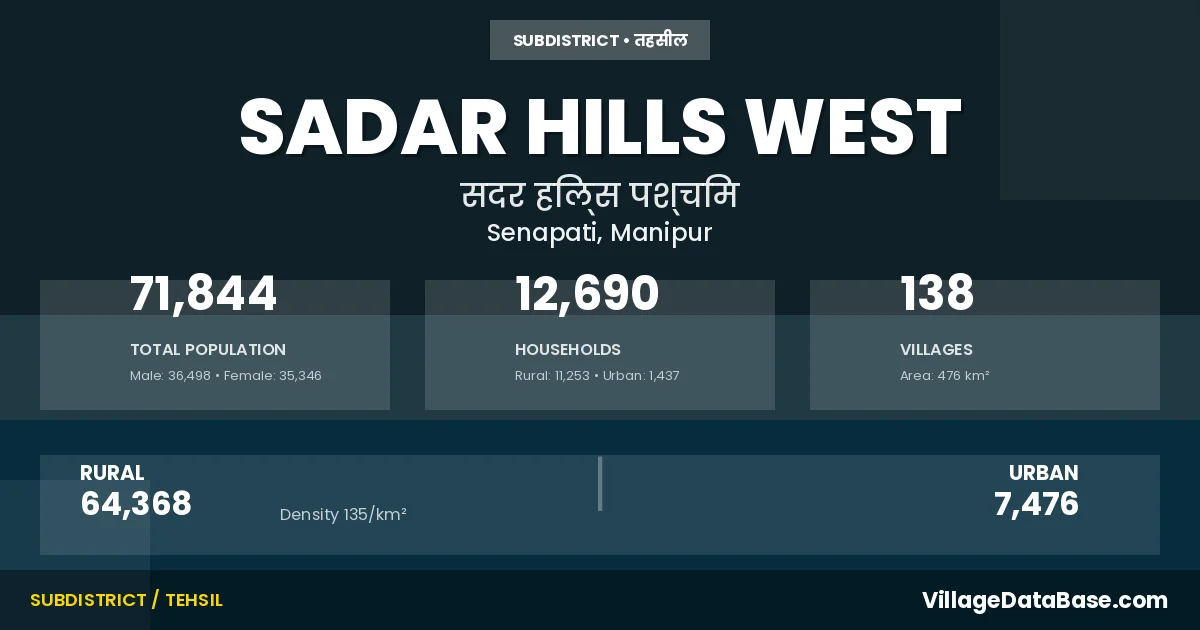 Sadar Hills West is a town and Subdivision in the Senapati district of the Manipur. In India, a Subdivision is a subdivision of a district responsible for the administration and revenue collection of a specific area within the district. Subdivisions play a crucial role in the local governance structure, contributing significantly to the development and administration of their communities.