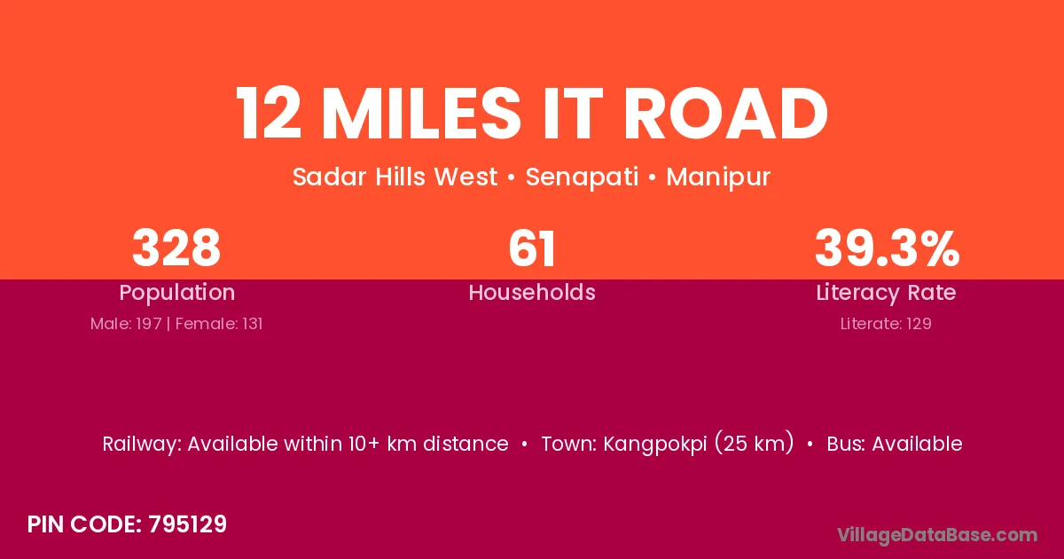 Kangpokpi (25 km) is the nearest town to 12 Miles It Road village for major economic activities and is located approximately 25 km away.