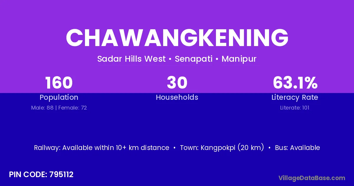 Kangpokpi (20 km) is the nearest town to Chawangkening village for major economic activities and is located approximately 20 km away.