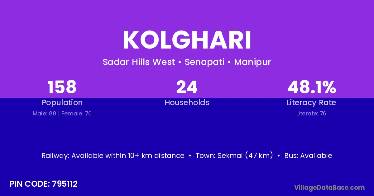Sekmai (47 km) is the nearest town to Kolghari village for major economic activities and is located approximately 47 km away.