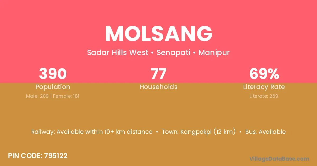 Kangpokpi (12 km) is the nearest town to Molsang village for major economic activities and is located approximately 12 km away.
