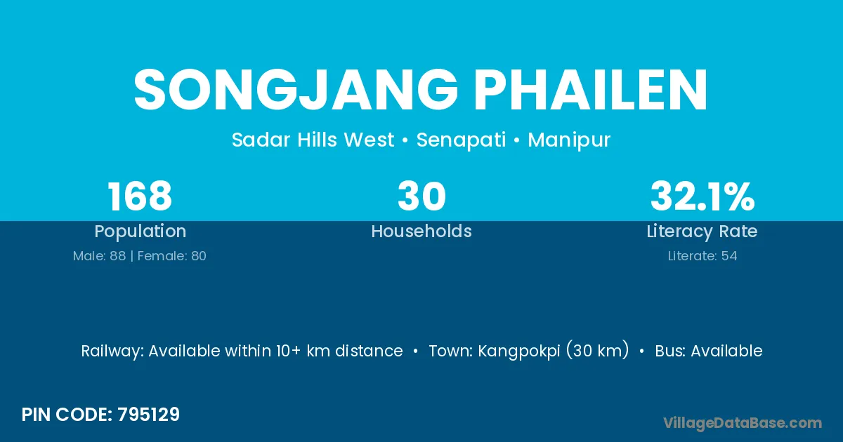 Kangpokpi (30 km) is the nearest town to Songjang Phailen village for major economic activities and is located approximately 30 km away.