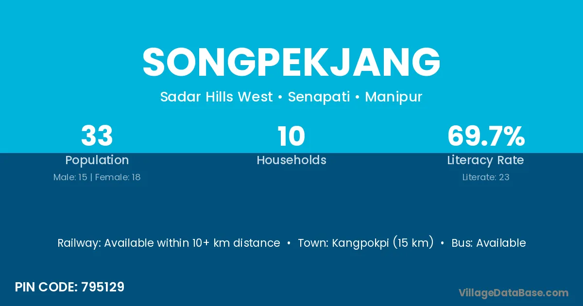 Kangpokpi (15 km) is the nearest town to Songpekjang village for major economic activities and is located approximately 15 km away.