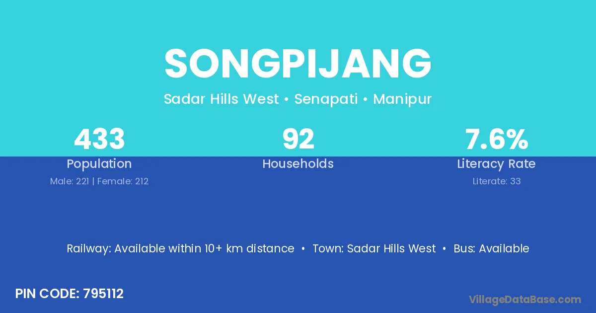 Songpijang village has a total population of 433 people, of which 221 are males and 212 are females.