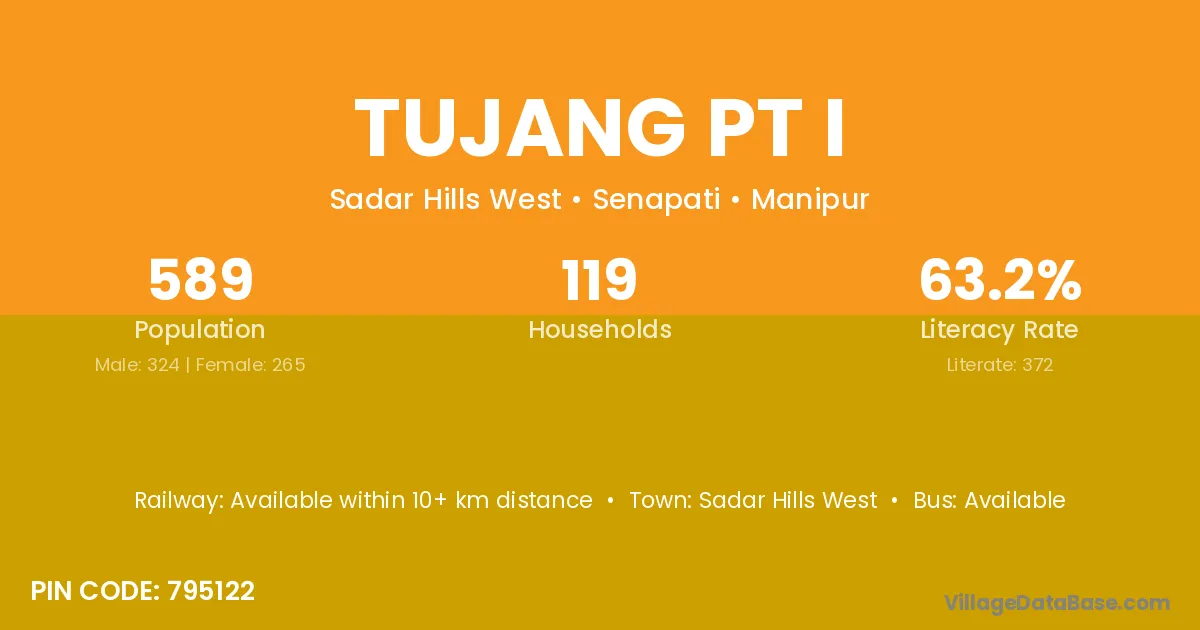 Tujang Pt I village has a total population of 589 people, of which 324 are males and 265 are females.