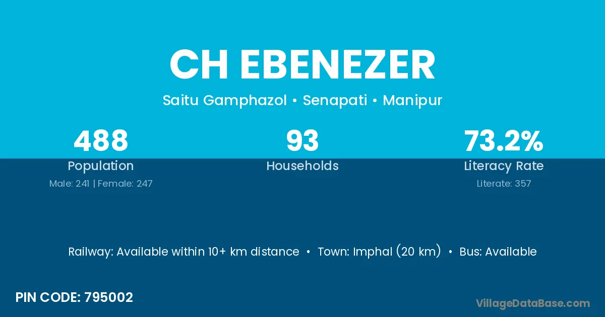 Imphal (20 km) is the nearest town to Ch Ebenezer village for major economic activities and is located approximately 20 km away.