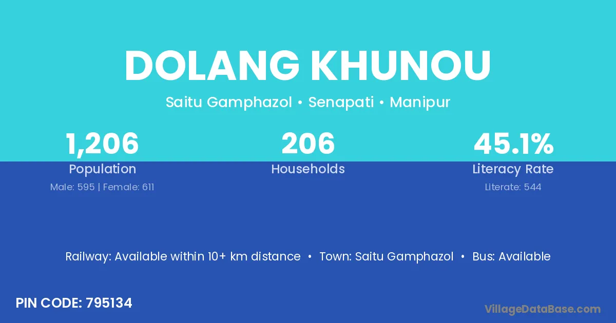Dolang Khunou village has a total population of 1,206 people, of which 595 are males and 611 are females.
