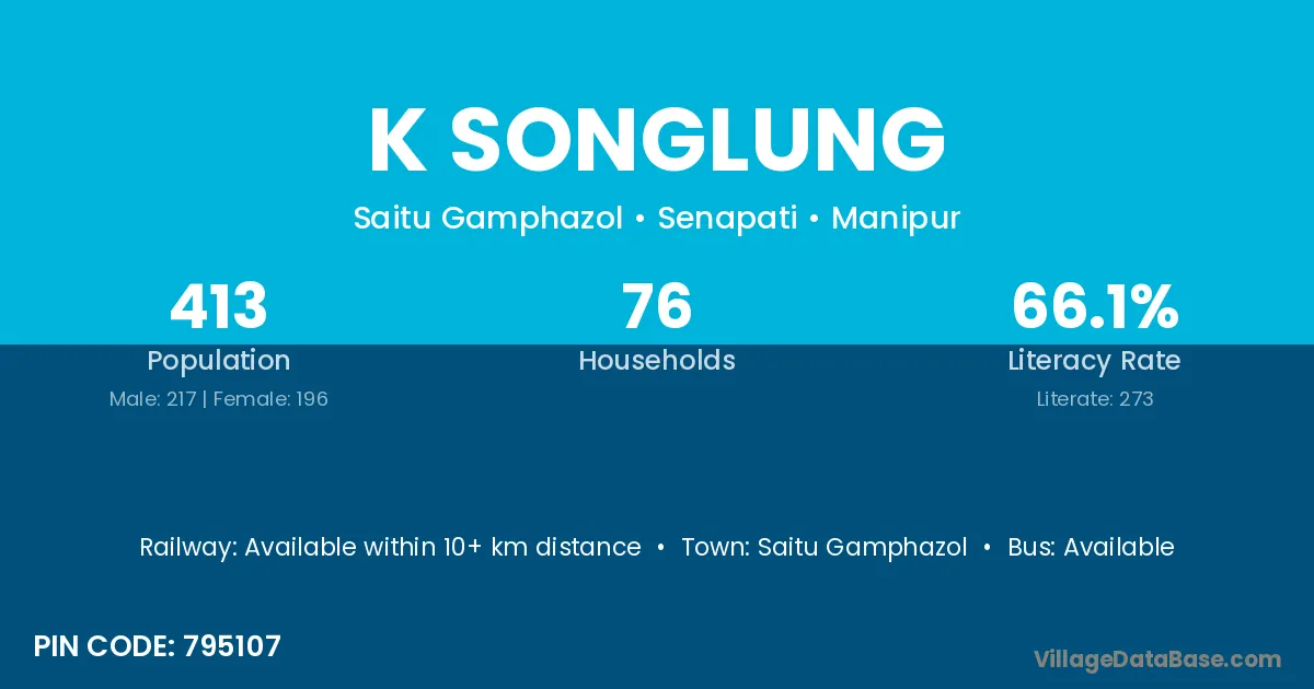 K Songlung village has a total population of 413 people, of which 217 are males and 196 are females.