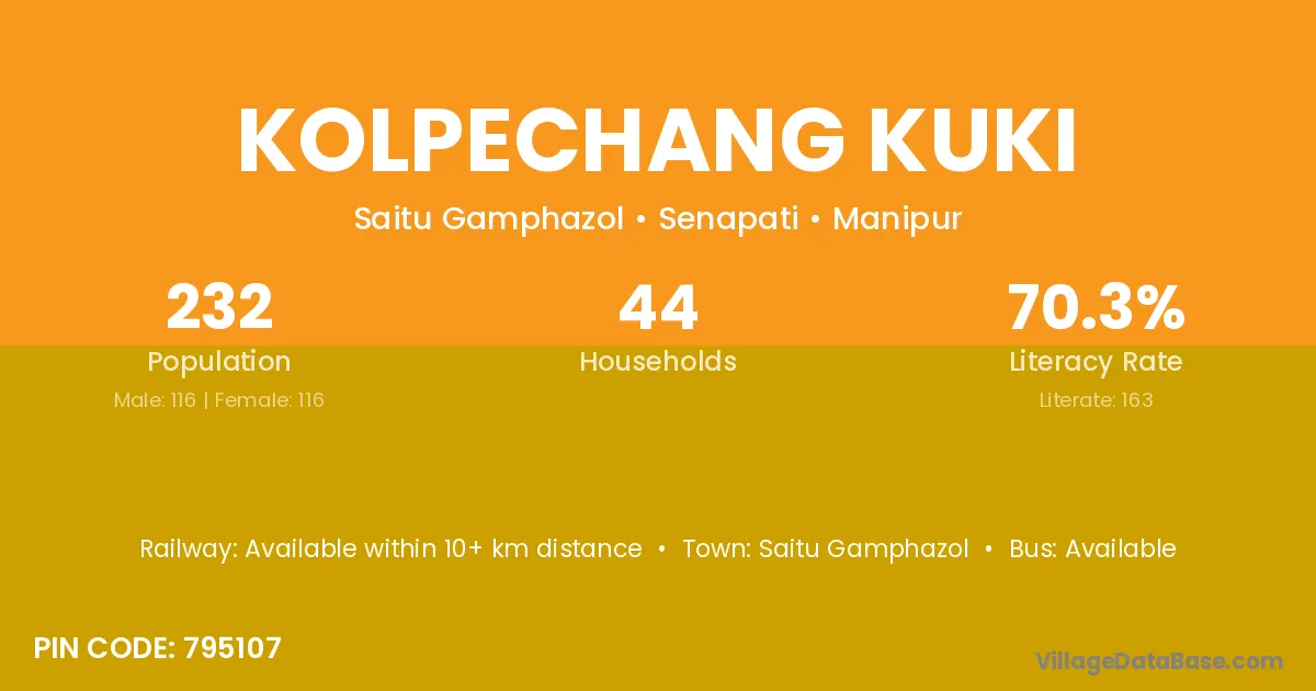 Kolpechang Kuki village has a total population of 232 people, of which 116 are males and 116 are females.
