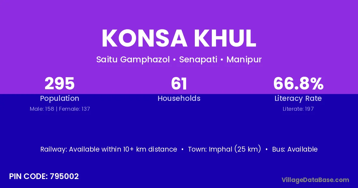 Imphal (25 km) is the nearest town to Konsa Khul village for major economic activities and is located approximately 25 km away.