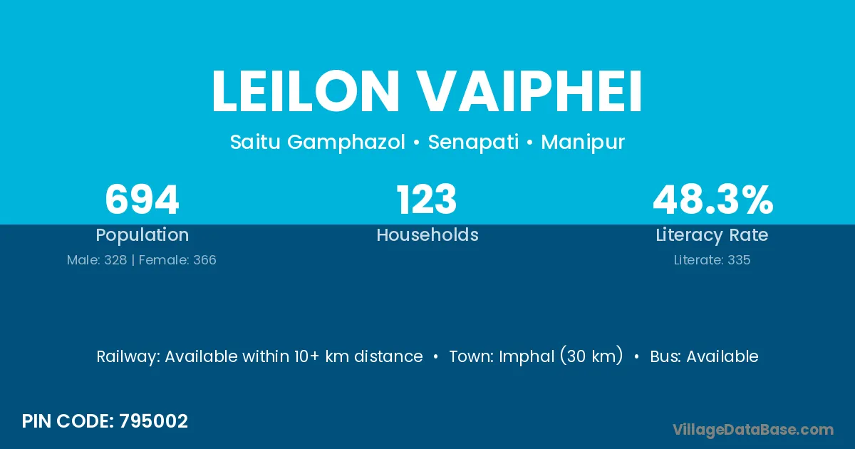 Leilon Vaiphei village has a total population of 694 people, of which 328 are males and 366 are females.