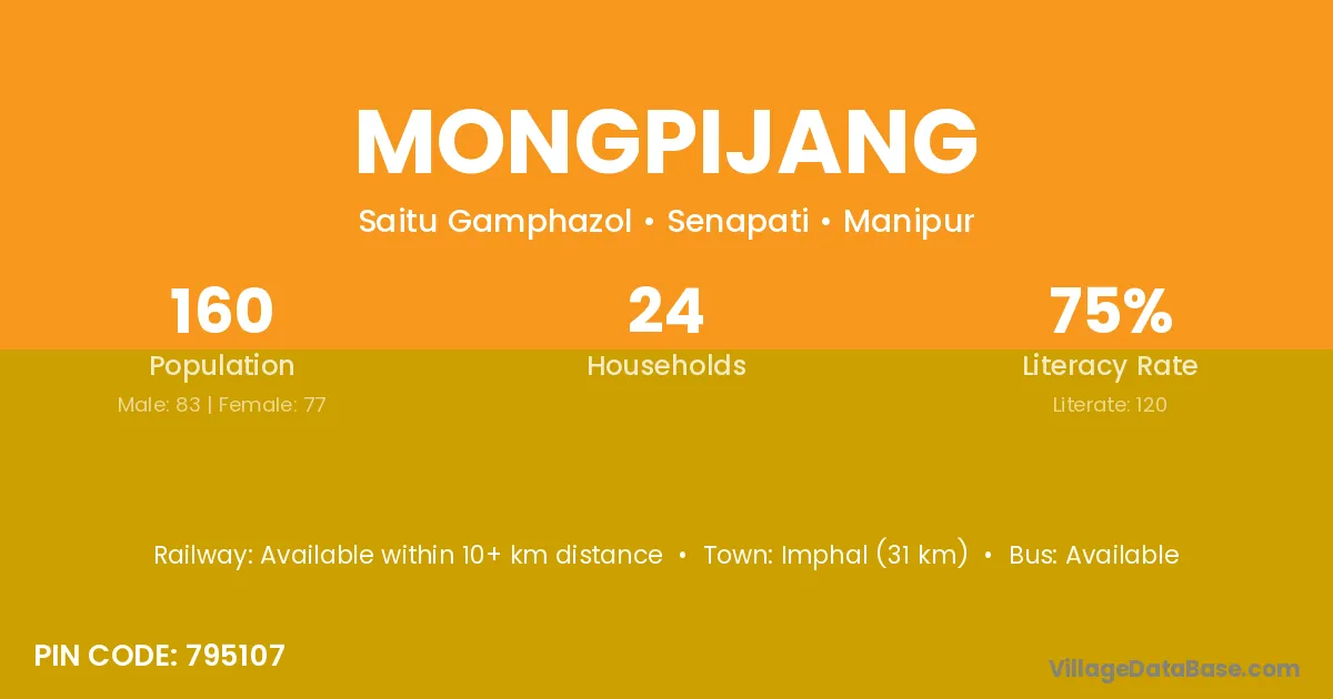 Imphal (31 km) is the nearest town to Mongpijang village for major economic activities and is located approximately 31 km away.