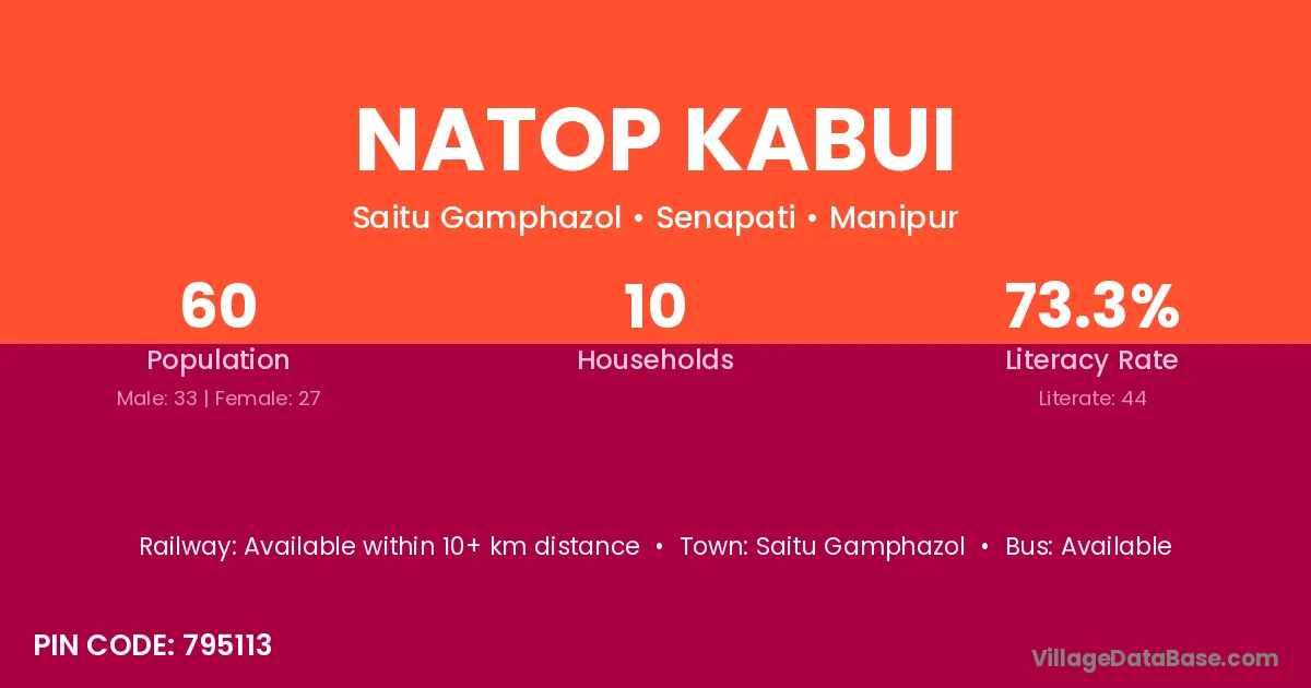 Natop Kabui village has a total population of 60 people, of which 33 are males and 27 are females.