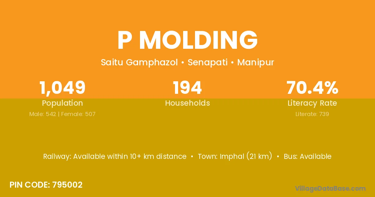 Imphal (21 km) is the nearest town to P Molding village for major economic activities and is located approximately 21 km away.