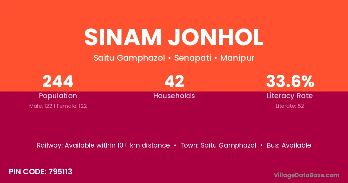 Sinam Jonhol village has a total population of 244 people, of which 122 are males and 122 are females.