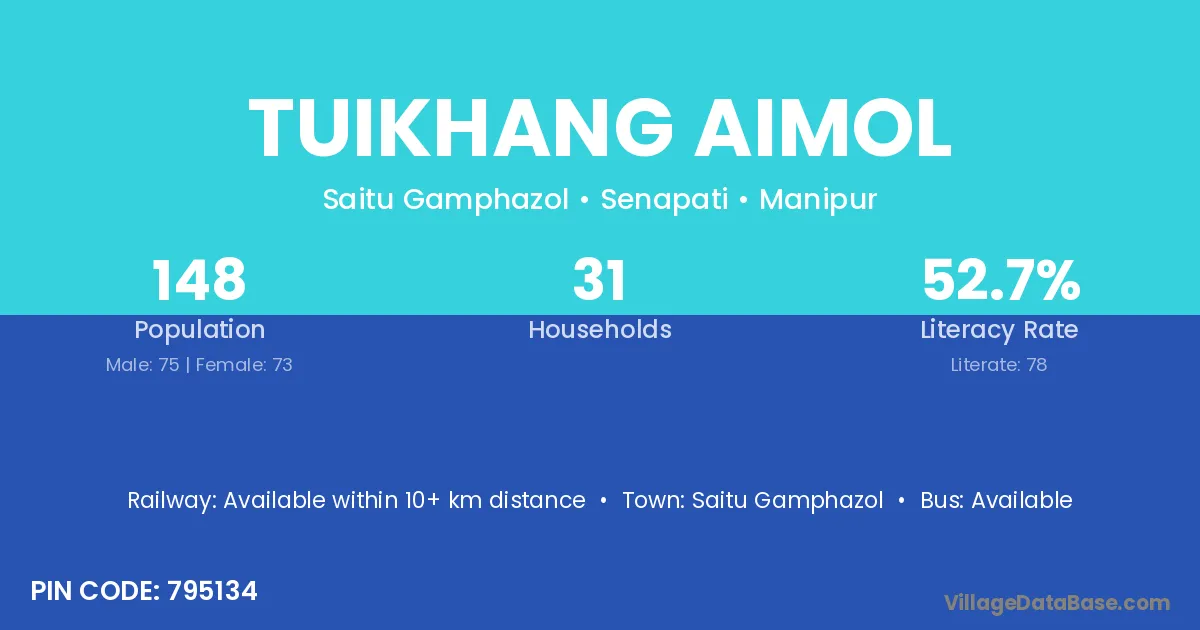 Tuikhang Aimol village has a total population of 148 people, of which 75 are males and 73 are females.