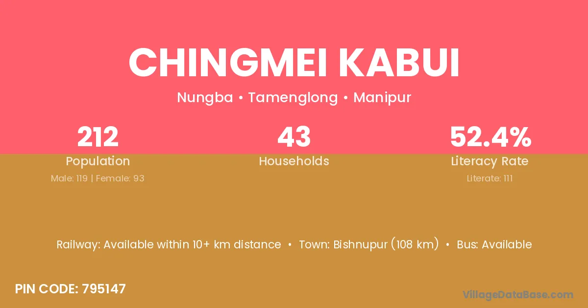 Chingmei Kabui village has a total population of 212 people, of which 119 are males and 93 are females.