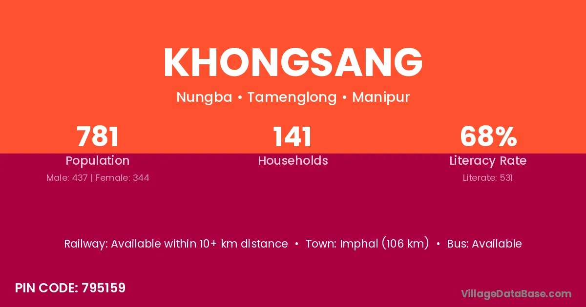 Imphal (106 km) is the nearest town to Khongsang village for major economic activities and is located approximately 106 km away.