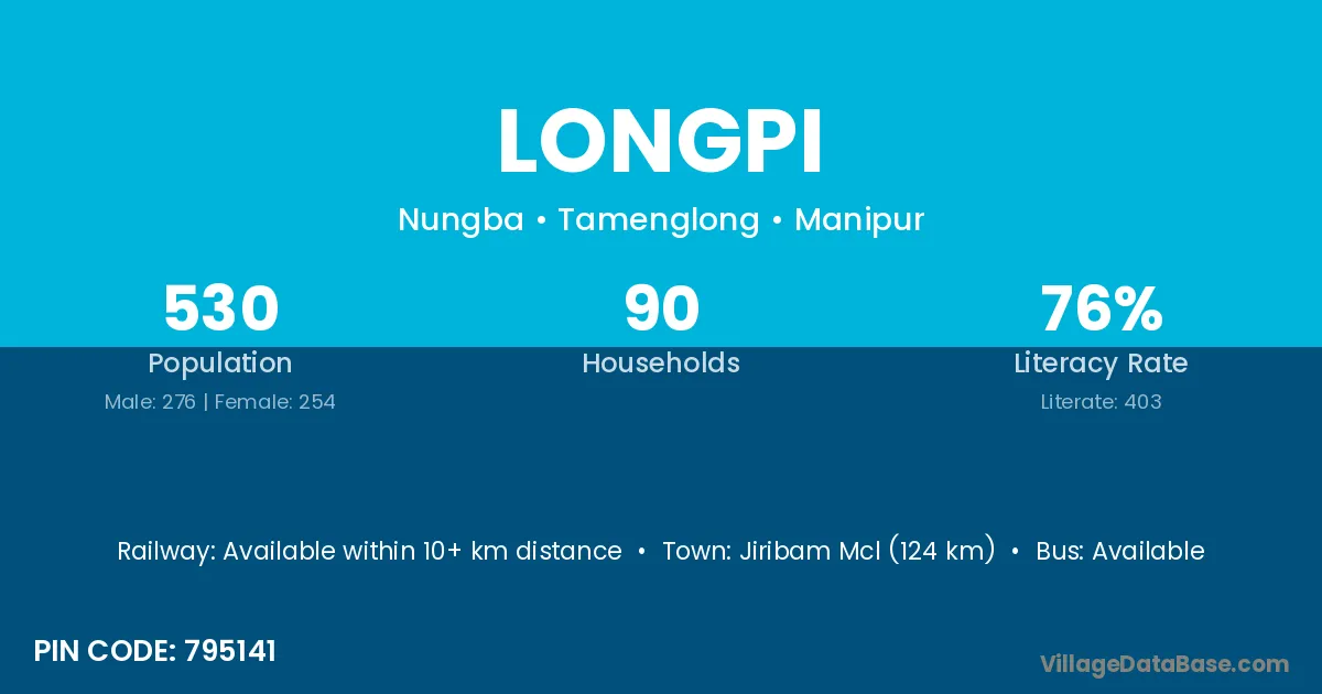 Jiribam Mcl (124 km) is the nearest town to Longpi village for major economic activities and is located approximately 124 km away.
