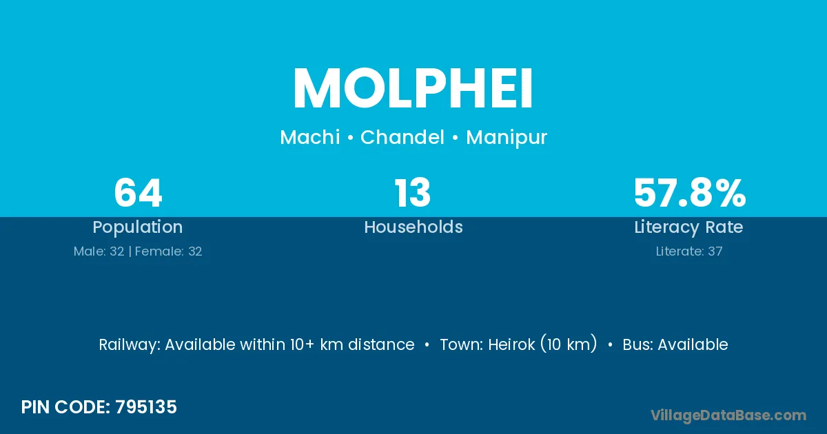 Bishnupur (60 km) is the nearest town to Molphei village for major economic activities and is located approximately 60 km away.