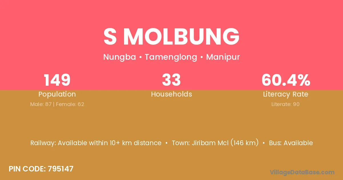 Jiribam Mcl (146 km) is the nearest town to S Molbung village for major economic activities and is located approximately 146 km away.