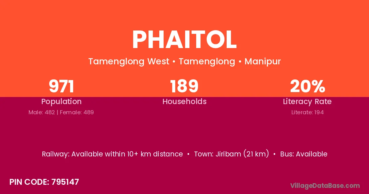 Jiribam (21 km) is the nearest town to Phaitol village for major economic activities and is located approximately 21 km away.
