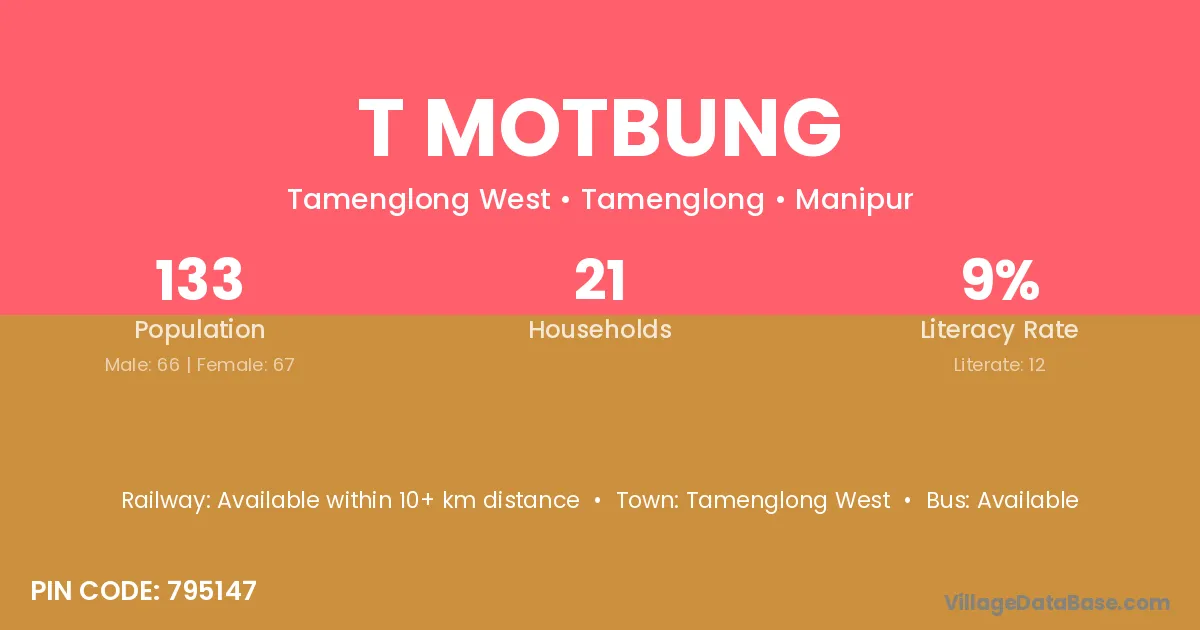 T Motbung village has a total population of 133 people, of which 66 are males and 67 are females.