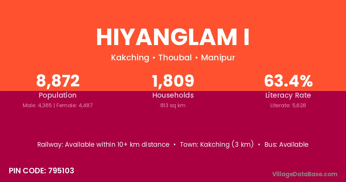 Kakching (3 km) is the nearest town to Hiyanglam I village for major economic activities and is located approximately 3 km away.