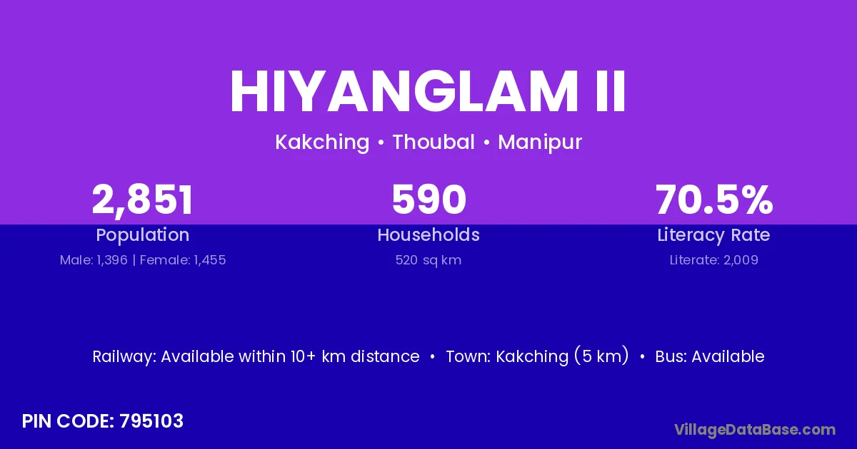 Kakching (5 km) is the nearest town to Hiyanglam Ii village for major economic activities and is located approximately 5 km away.