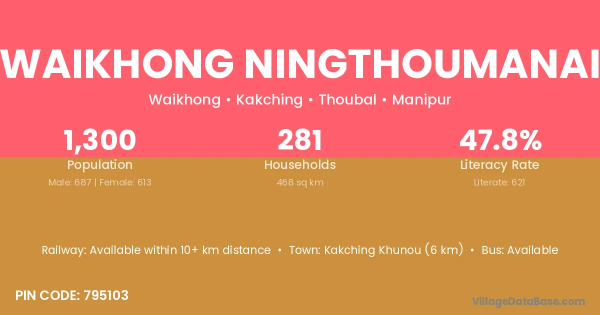 Kakching Khunou (6 km) is the nearest town to Waikhong Ningthoumanai village for major economic activities and is located approximately 6 km away.