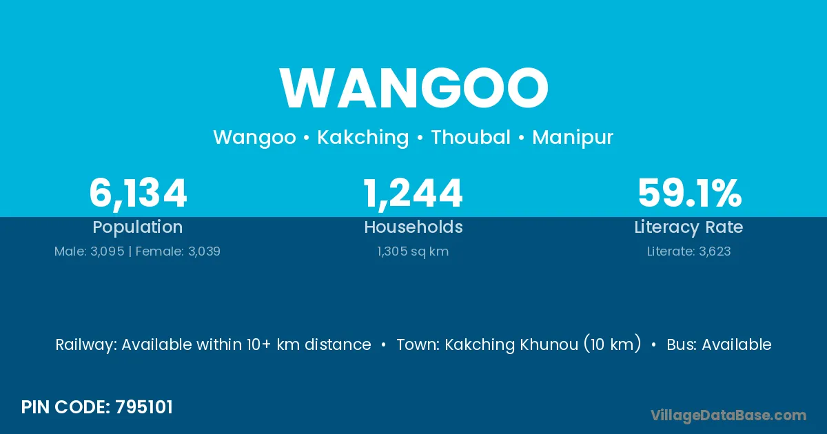 Kakching Khunou (10 km) is the nearest town to Wangoo village for major economic activities and is located approximately 10 km away.