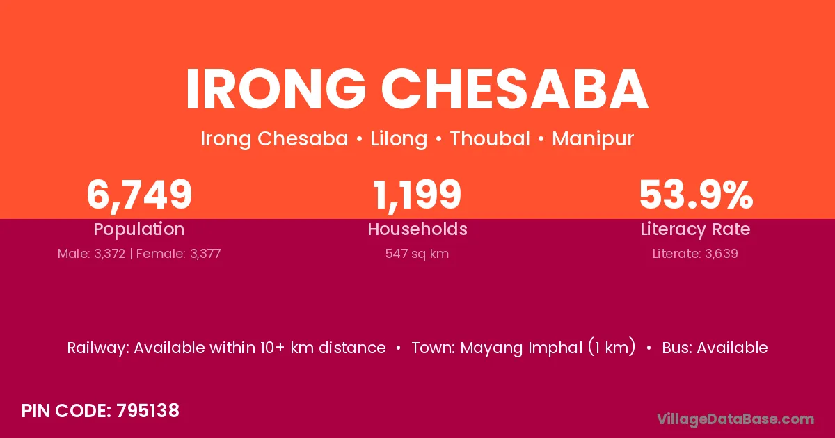 Mayang Imphal (1 km) is the nearest town to Irong Chesaba village for major economic activities and is located approximately 1 km away.