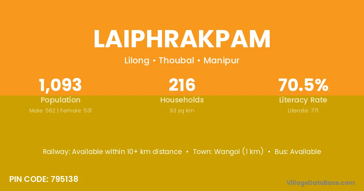 Laiphrakpam village has a total population of 1,093 people, of which 562 are males and 531 are females.