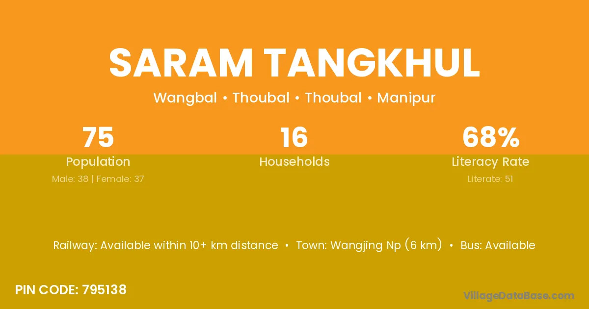 Wangjing Np (6 km) is the nearest town to Saram Tangkhul village for major economic activities and is located approximately 6 km away.