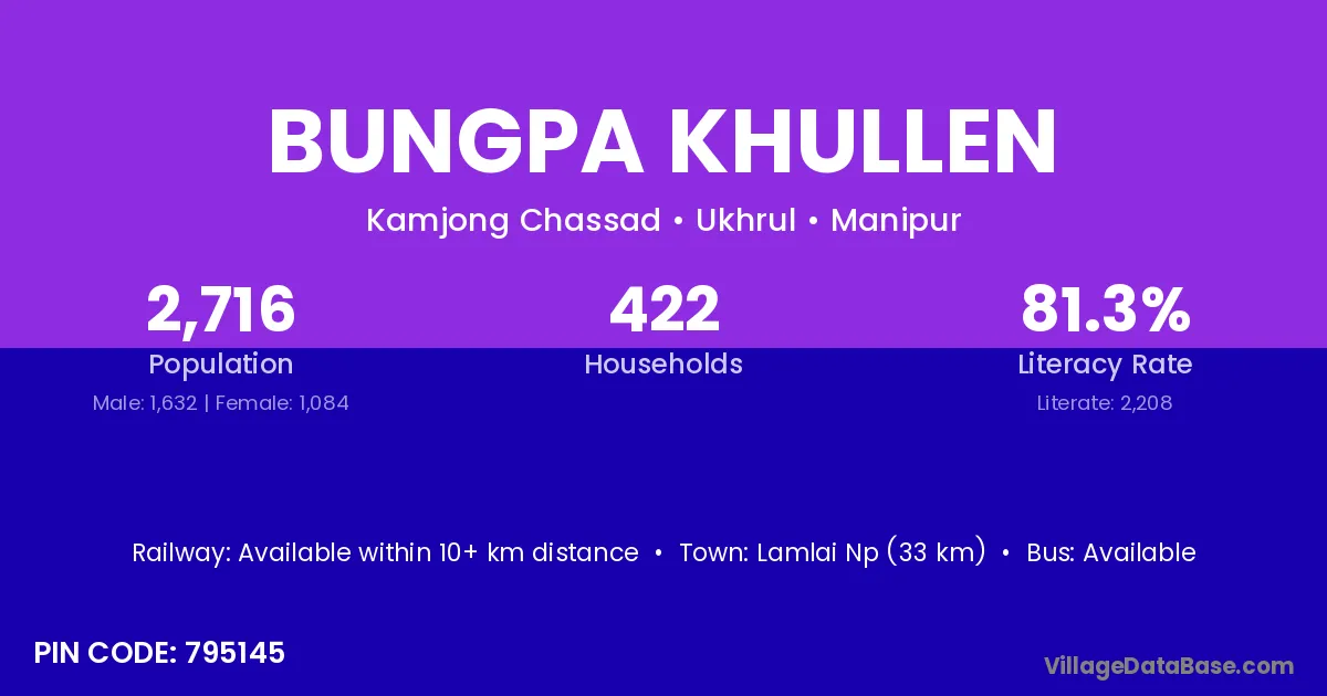 Lamlai Np (33 km) is the nearest town to Bungpa Khullen village for major economic activities and is located approximately 33 km away.
